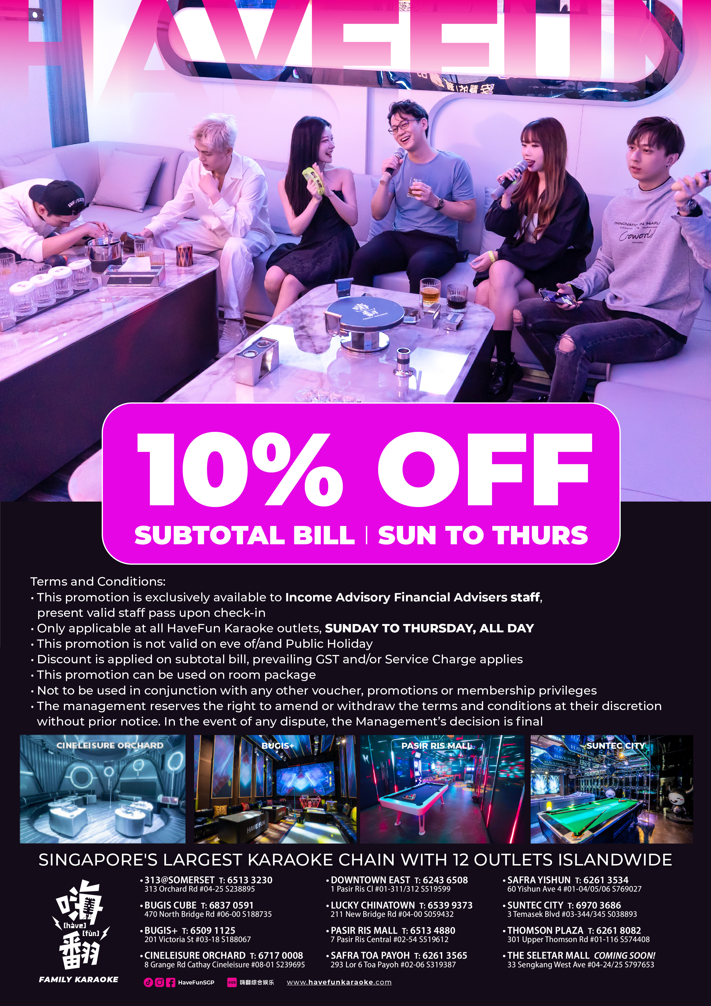 • Only applicable at all HaveFun Karaoke outlets, Sunday to Thursday, all day