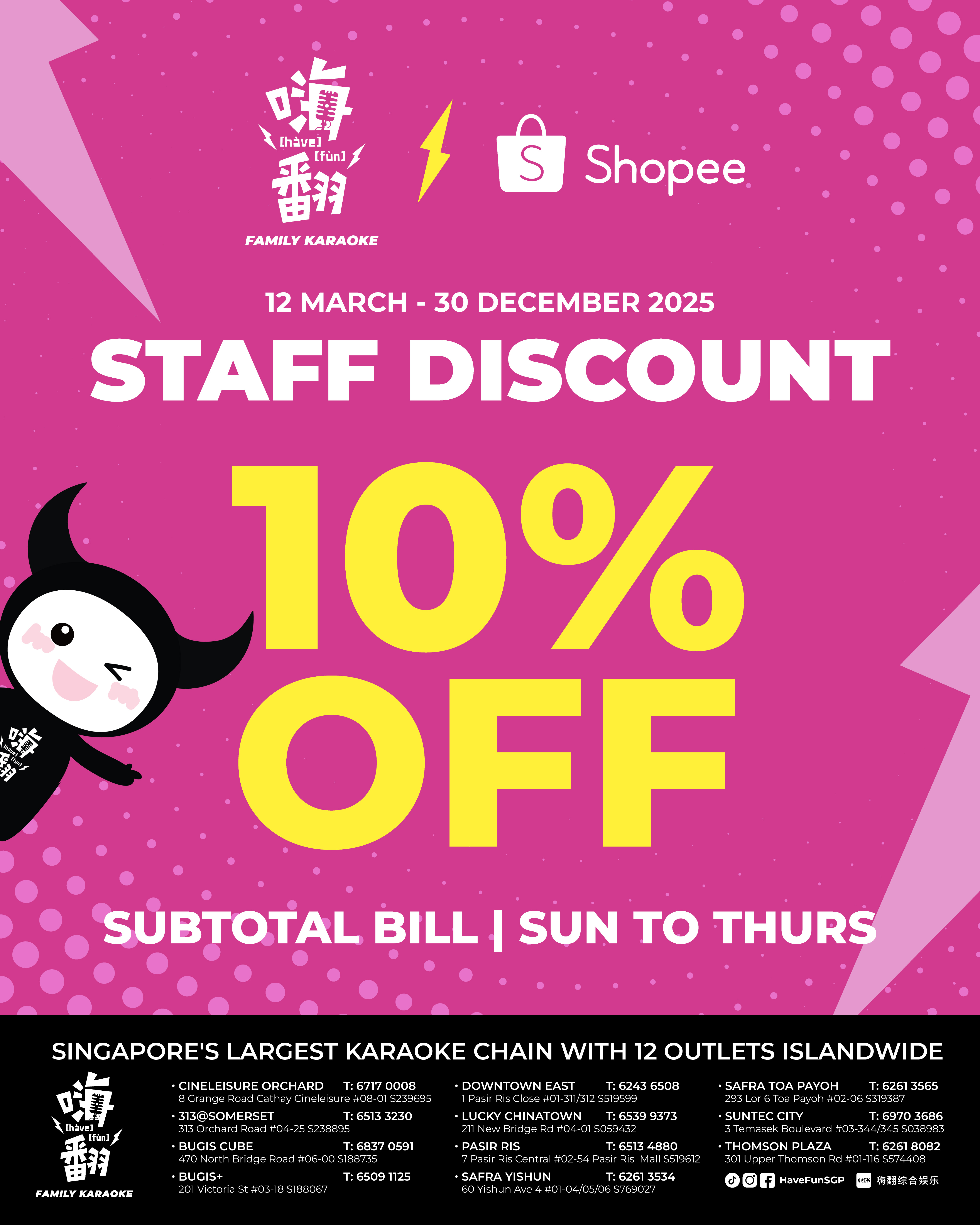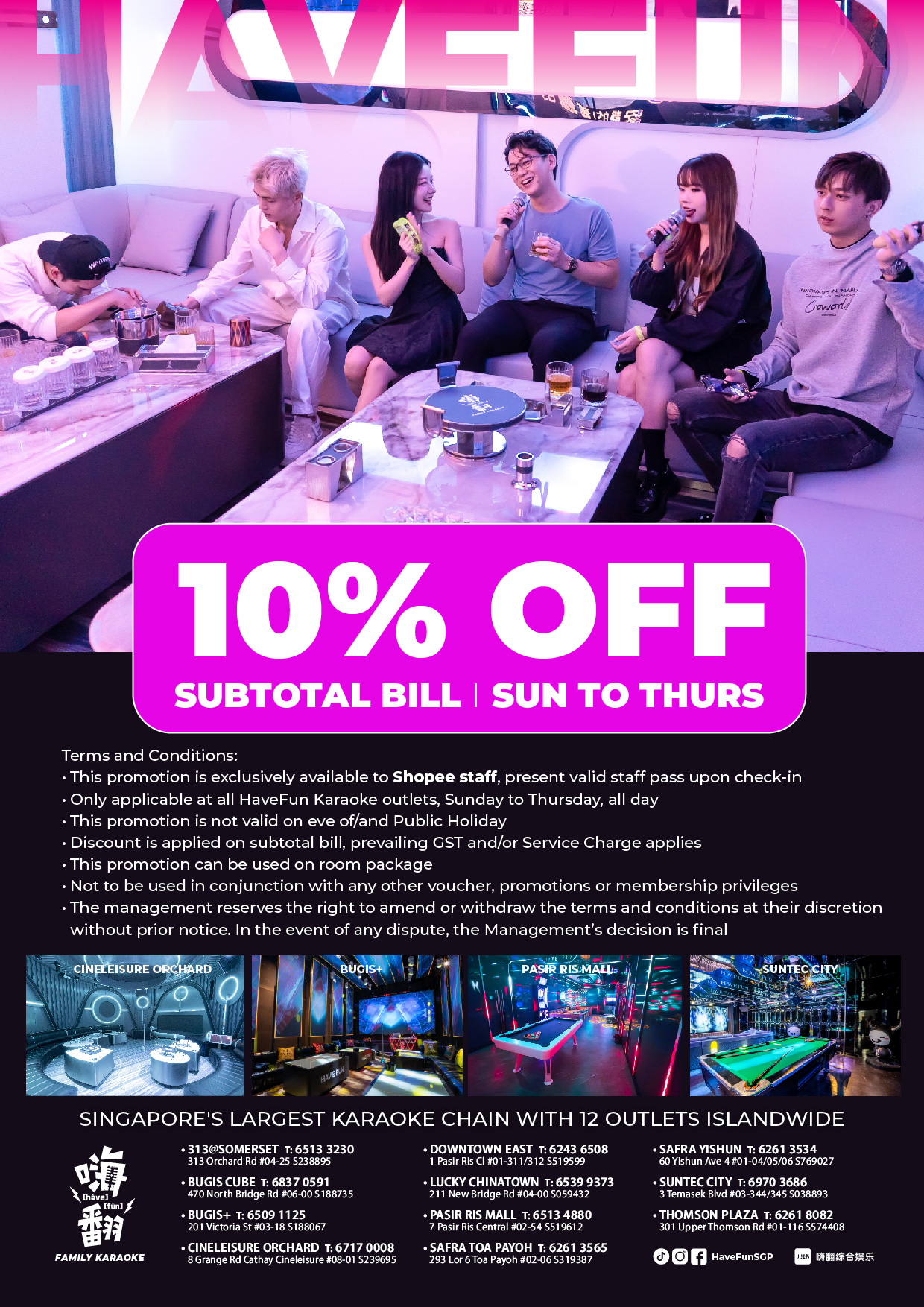 - Only applicable at all HaveFun Karaoke outlets, Sunday to Thursday, all day